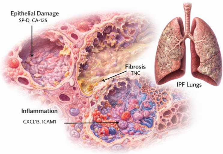 IPF typically begins when genetic and environmental factors trigger injury to epithelial cells in the lung, particularly alveolar type 2 (AT2) cells. These cells are essential for maintaining normal lung function and enabling efficient gas exchange. When AT2 cells are damaged or die, they release markers of epithelial injury into the bloodstream. Two such markers used in the PROLIFIC panel are surfactant protein D (SP-D) and cancer antigen 125 (CA-125).