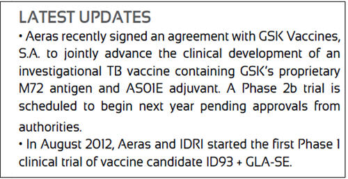 Aeras (www.aeras.org) is a not-for-profit enterprise developing next-generation TB vaccines. It has a pipeline of vaccine candidates in preclinical, Phase 1, and Phase 2 development and partnerships with small and large companies, government and academic institutions, and nongovernmental organizations (NGOs). It aims to have a vaccine available worldwide in less than 10 years and ultimately protect people from infection, transmission, onset, and recurrence of the most severe forms of the disease.