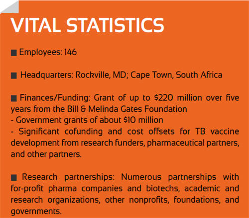 Although other companies and institutions are working on pieces of the TB challenge, and some have vaccine candidates in their pipeline, Aeras is the only player organized solely around the vaccine goal with integrated development and manufacturing functions all operating in a single organization. “We have the ability to take the innovative discoveries by academic scientists and other entities — drug candidates that might not otherwise move forward without our support — and facilitate their development and testing,” says Aeras President & CEO Jim Connolly. “We’re not looking ultimately for shareholder return or paying back investors in the classic sense; as a result, we are able to take more risks and form more flexible and nontraditional alliances than for-profit companies.” Aside from its not-for-profit status, Aeras is a real company in every respect. It has six vaccine candidates in its clinical pipeline and is testing various vaccine platforms and TB antigens. It has built a $30 million production facility sufficient to supply its clinical trials and then some. And it is tackling the scientific challenge of developing the first vaccine effective in adults and against pulmonary TB. The clinical trials will determine which vaccine candidate or candidates survive. Part of the challenge is the lack of preclinical models and predictive assays to test any vaccine for this disease. “To test a TB vaccine to determine whether it is protective requires relatively large Phase 2b trials that can cost up to $30 to $40 million apiece,” says Connolly. “We are fortunate to receive funding from donors and partners like the Gates Foundation, Wellcome Trust, and the U.S., United Kingdom, and Dutch governments, among others to help support our activities, but more will be needed as we progress into later-stage trials.”