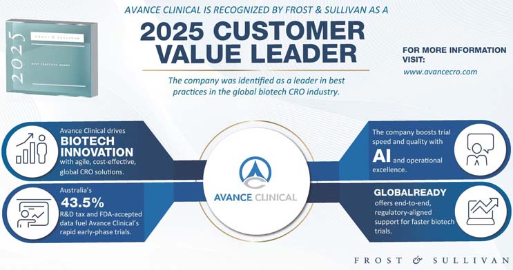 Frost & Sullivan has named Avance Clinical the recipient of its 2025 Global Customer Value Leadership Award in the biotech contract research organization (CRO) sector, highlighting the company’s outstanding performance in delivering exceptional client value through innovation, service excellence, and technology-enabled trial optimization.