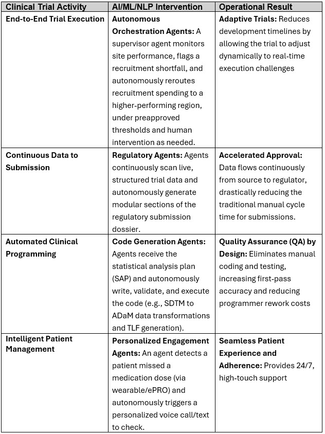- Examples: Autonomous trial monitoring agent, self-healing infrastructure in IT, end-to-end medical document generation, closed-loop compound optimization in drug discovery