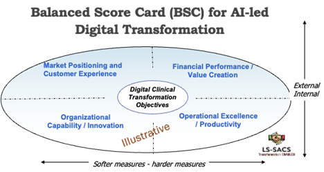 AI-led transformation requires a holistic strategy that encompasses multiple topics or levers to achieve most of the transformation objectives. Some potential KPIs (with examples for clinical trials) can be developed using the balanced scorecard (BSC). A typical BSC provides a balanced approach for most of the KPIs along four groups and assigns a weight based on a company’s own vision/plans, goals, and competitive positioning:
