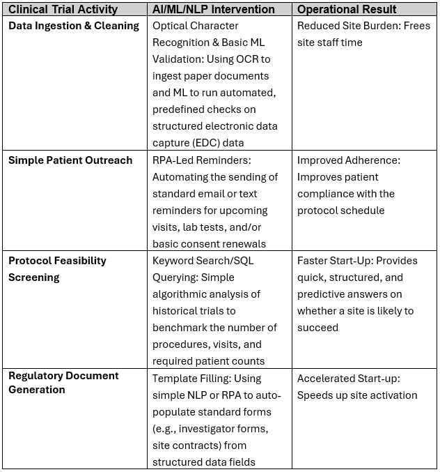 Some illustrative examples in clinical trials and operations for this phase on automating repetitive, rules-based tasks using traditional RPA, combined with basic ML to handle structured data, include: