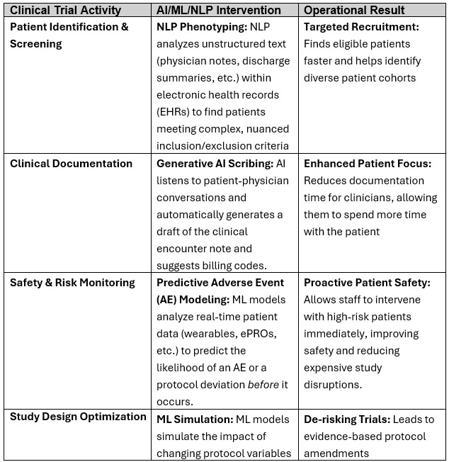 Some illustrative examples in clinical trials and operations for the Phase 2 leveraging of advanced ML and NLP to handle unstructured data, provide insights, and augment human decision-making are provided below: