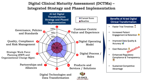 - Operational Excellence/Productivity: To ensure most activities are conducted using digital means and ensure tracking and monitoring of the progress of these initiatives. Potential KPIs can include selected process cycle time reduction, percentage of high-value tasks automated and AI model accuracy/F1 score, and percentage reduction in trial time or patient recruitment