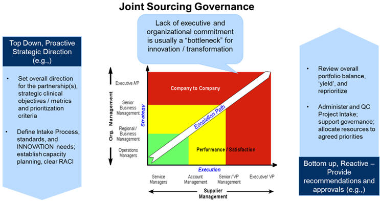 Transformed clinical operations require transparent and committed partnerships to achieve the established strategic goals of the engagement. Structured, multi-tiered governance that tracks tangible partnership metrics and strategic and operational objectives, including customers’ and employees’ satisfaction, has been the cornerstone of the most successful partnerships.