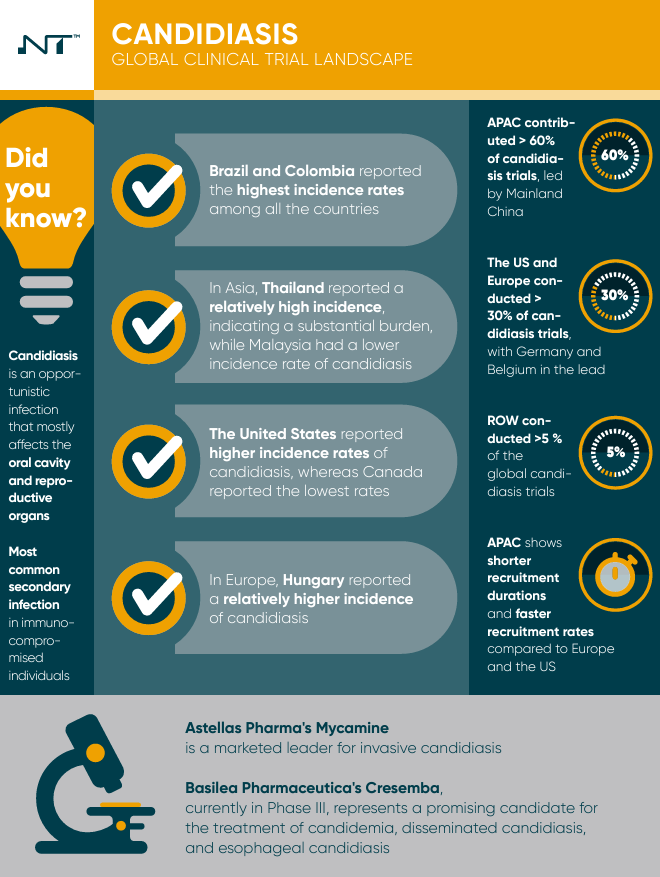 With complex patterns across regions and an evolving landscape marked by drug-resistant strains, the urgency for innovative therapeutic solutions is emphasized. While the standard treatment involves antifungal medications, challenges persist, necessitating a comprehensive understanding of the disease spectrum. Since 2018, over 200 global clinical trials have been initiated, with the Asia-Pacific region leading. Recent breakthroughs in antifungal medications provide optimism, with approvals like Brexafemme (2021) and Rezzayo (2023) addressing specific manifestations.