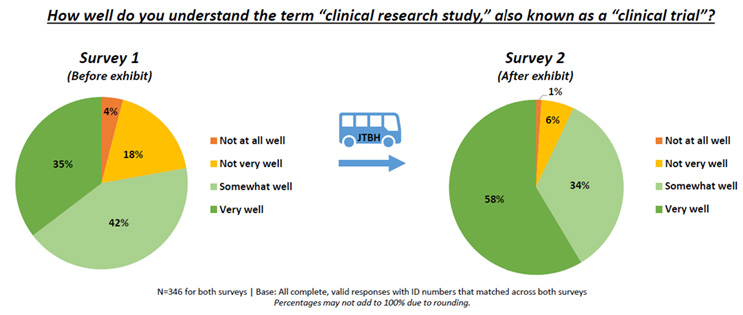 The impact of the JTBH program is routinely evaluated to optimize the effectiveness of this initiative. Visitors are invited to complete surveys before and after viewing the exhibit to gauge any changes in their understanding and perceptions of clinical research. The results speak volumes.
