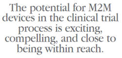 It is easy, therefore, to see why the life sciences industry is interested in the potential of M2M technologies in clinical trials. Continuous monitoring can help researchers to confirm treatment adherence with certainty, which we cannot do today. As a result, study sponsors and managers can more accurately determine efficacy because non-adhering patients can be filtered out. In addition, it can help to facilitate subject recruitment and, ultimately, shorten the length of a trial. If participants are not adhering, trial managers can drop them quickly, yielding earlier insight into how many subjects will be required to complete the trial. Further, continuous monitoring can help to improve participant retention as recording critical data and adherence will be more convenient.
