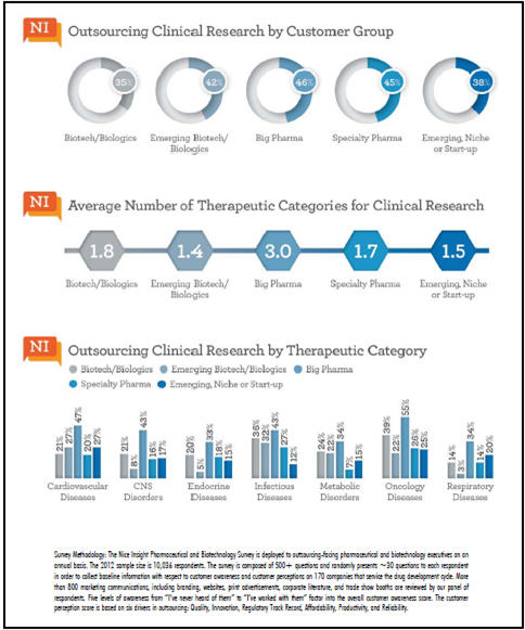 Fraught with a multitude of FDA regulations and an average duration of eight years, it’s no surprise that clinical research is one of the most frequently outsourced elements of the drug development process. According to Nice Insight’s most recent outsourcing survey, nearly half of Big Pharma respondents (46%) stated they would engage a CRO for clinical research during the next 12 months. Specialty pharma companies and emerging biotechs were just as likely to outsource clinical research, with 45% and 42% respectively. Emerging pharma and big biotech were slightly behind, with roughly 1/3 stating it is a service they will outsource in the coming year.