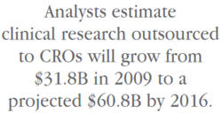 The practice of using CROs to conduct clinical trials is continuing to grow in popularity, especially as trials become more complex. Analysts estimate clinical research outsourced to CROs will grow from $31.8B in 2009 to a projected $60.8B by 2016. Beyond reducing sponsors’ fixed costs, CROs have proven their ability to add value through expertise — from patient recruitment to navigating an increasingly tricky regulatory environment. And at the same time as drug makers have been focusing efforts on reducing the time and expense associated with bringing a new medicine to market, ironically it seems the FDA has been catching some blame for drug development costs increasing.