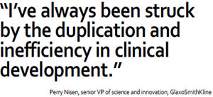 Outside GSK, however, the people running small development companies may well wonder, Why should I add this to my plate? Why should I make my data transparent? “For all the same reasons that we do — to leverage the opportunity to cross-analyze and harmonize the information,” answers Nisen. “If you move to common standards, you have to give a little to get more back, on some level. But it will not be so easy for small companies to do that unless, from the inception, they adhere to a common standard and leverage the information to model and simulate what they want to do. It might make for much better studies on their part as well, I would think.”