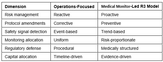 In particular, the integration of physician-led medical governance determines whether fast start-up translates into sustainable quality or downstream regulatory vulnerability.6 This article demonstrates why medical monitor-led implementation of E6(R3) outperforms operations-only models across six critical performance dimensions.