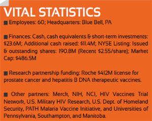 Inovio is developing DNA-based vaccines and its Cellectra Electroporation Delivery Technology platform in multiple disease areas — therapy for cervical, prostate, breast, and lung cancers and Hep B & C; and prevention of HIV, flu, and malaria — with the combined support of the U.S. government, the stock market, and numerous research grants.