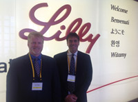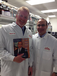 Miseta and Wright participated in a reporter roundtable, led by Jan Lundberg, EVP science and technology, and president of LRL, with additional insights provided by 14 members of the LRL leadership team. After the roundtable, LRL leadership and members of media toured the Alzheimer’s Disease Lab, Advanced Analytics Lab, and the Automated Synthesis Lab (ASL) — the only fully integrated remote access chemistry lab in the world. Past Life Science Leader cover feature Alan Palkowitz, Ph.D., took time out to pose with Wright for a photo. In addition to touring the labs, both Wright and Miseta were also afforded the opportunity to attend Eli Lilly’s investment community meeting, led by CEO John Lechleiter, Ph.D. and members of the company’s executive leadership team. |