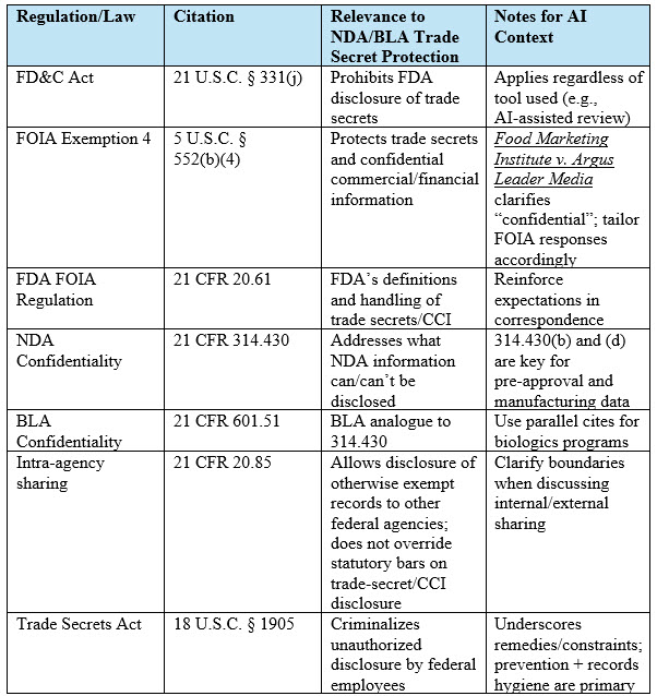 Table 1. Summary of Key Laws and Regulations Protecting NDA/BLA Trade Secrets: