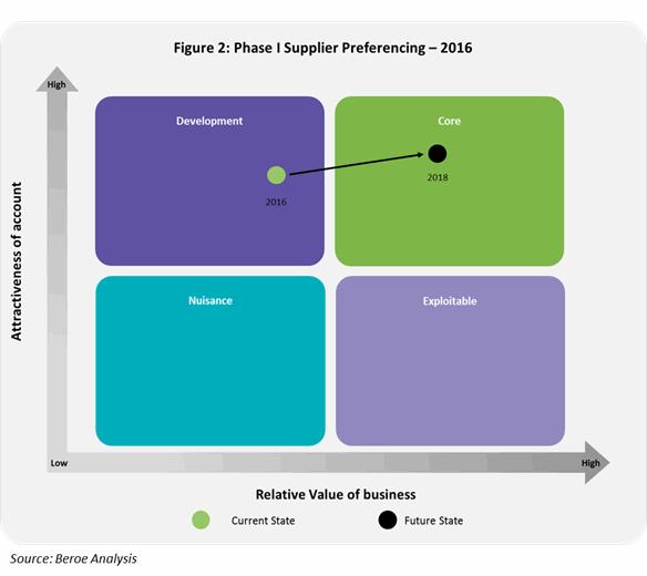 Phase I suppliers view large pharma accounts in the development area of their business. The buyers are considered highly attractive as they bring in high purchase orders, good payment terms, and greater brand visibility. This acts as an enabler to move the accounts into a supplier’s core business area through strategic partnerships in the near future.