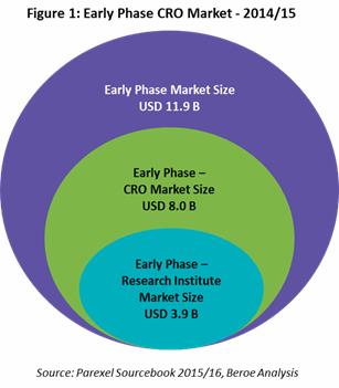are outsourced at greater than 60 percent by pharma, as the trials are small in number and a captive unit requires a large amount of capital. The supply market for early phase is comprised by CROs, research centers, and academic institutes. The market size that is comprised by the CROs is estimated to be around USD 8 billion, which is about 67 percent of the early phase market. Academic institution and research institutes comprise the remaining market at USD 3.9 billion (Figure 1). [1]