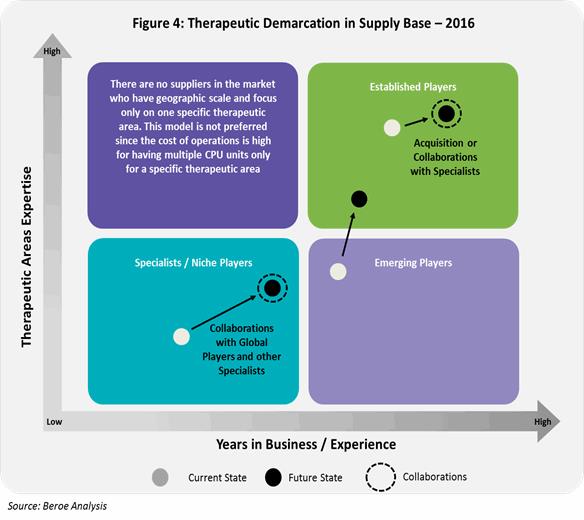 Currently, Global CROs have the capability to cater across therapeutic areas having a greater years of experience compared to specialists or niche players. They are most likely to acquire specialists in the future or collaborate with specialists who have a greater access to specialist patient populations. Emerging players on the other hand, move forwards capability expansion in terms of therapeutic area and geographic presence.