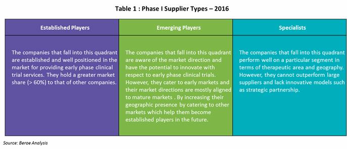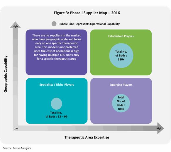 Phase I supply market consists of three types of suppliers: 1) Global established players 2) Emerging players and 3) Specialists/ Niche players. This distinction is based on the operational capability which includes - years of experience, trials experience and total number of CPU beds; and therapeutic expertise.