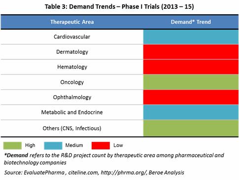 Demand Trends: Oncology, Infectious Diseases, CNS and Cardiovascular are the therapeutic areas having the highest number of phase I projects and products with respect to pharma and biopharma pipeline. The below Table 3 maps the demand trends by therapeutic area based on the phase I projects in pipeline of both pharma and biotechnology companies. [3]