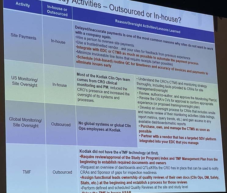 Don’t worry, I’m not going to comment on every session I attended. I will say, though, that there were a few that I really wished were longer. For example, Jamie Christensen, director, at Kodiak Sciences gave a really interesting presentation called, “Challenges and Successes of Bringing Trial Activities In-House While Partnering with a CRO.” Wait! I do have a photo of a slide from her presentation (see below). Although, it’s probably too small to read, it shows different activities like site payments, site monitoring, and TMF and talks about what lessons they learned from executing these activities either in-house or via outsourcing. I loved how she said if you choose to take on some of these activities in-house, “you need to have cash and courage.”