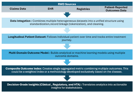 Therefore, the proposed framework is a patient-centered, continuous outcome measurement model using RWE derived from multiple healthcare data sources. The model emphasizes multidimensional outcomes, longitudinal patient trajectories, integrated data ecosystems, and composite outcome indices to support decision-grade healthcare insights.4,5