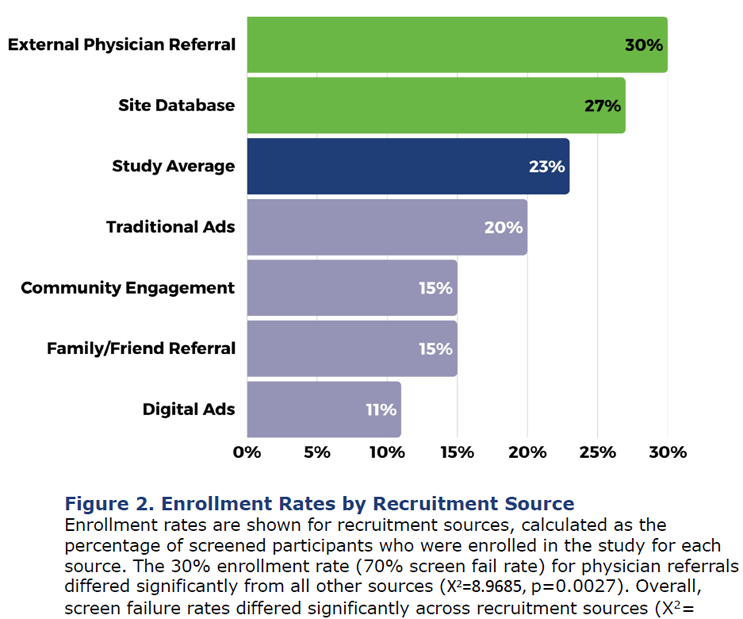 Moxon: The recruitment source that had the best conversion rate was physician referrals. [See figure 2 from Acumen’s poster presentation below.] That means our study sites had a partner clinic or other physicians in their local area that referred a patient. And that had the lowest screen fail rate overall. But the site databases brought in the most participants and had the second-lowest screen fail rate. It was pretty close between those two sources as being the best for our study.