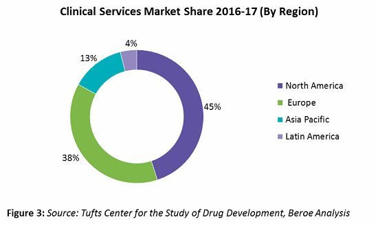 Of the total clinical spend, early phase clinical contributes 12 percent, and phases 2-4 contribute the highest, at 58 to 60 percent. In terms of clinical services market share by region, North America and Europe together hold greater than 80 percent of the CRO market, with pharma spending around 45 and 38 percent, respectively, of their clinical trial R&D in these regions. Figure 3 provides the clinical services market share by region.