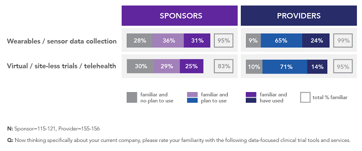 Figure 1: Familiarity and use of wearable/sensor technology and virtualized trial approaches among sponsors and providers3