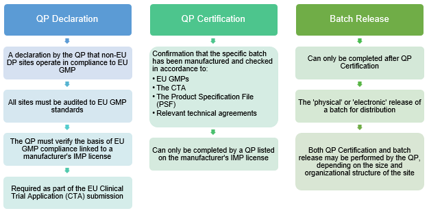 On the other hand, QP Certifications are batch-specific documents and are related to EU GMP, the Clinical Trial Application (CTA), and the Product Specification File (PSF). QP certifications involve a thorough and extensive review of batch documentation and clinical documents to “certify” a batch can be released for a clinical trial. It is noteworthy to make the distinction that a QP certification does not equate to batch release, as the latter may be done by non-QP quality personnel. Again, this is dependent on the size and organizational structure of the company.
