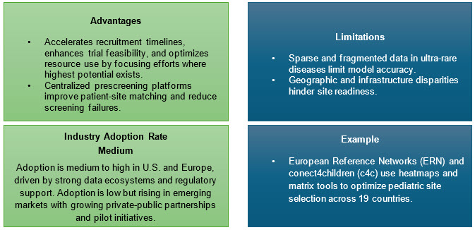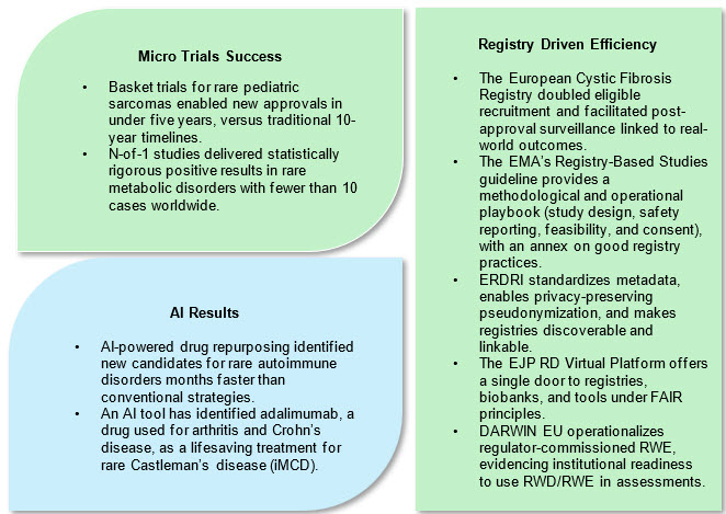 Leveraging RWD, genomic profiling, and AI algorithms for site selection is supplanting legacy CRO methods. Collaborations with patient advocacy organizations and global data platforms (e.g., RARE-X, GRDR) facilitate direct recruitment and disease awareness.7,8