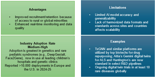 AI tools accelerate diagnostic screening, patient identification, phenotype classification, and molecular target discovery. AI algorithms such as DeepGestalt and network-based drug repurposing platforms have expedited trial recruitment, improved clinical endpoint selection, and even identified new therapies for conditions like Castleman's disease.