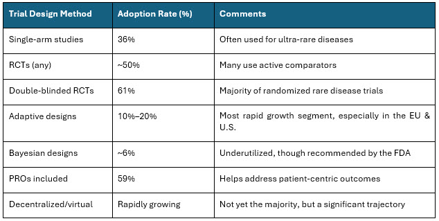 The rare disease clinical trial sector is expanding quickly, with method adoption moving toward decentralized, adaptive, RWE, and patient-driven models, while conventional RCTs and single-arm studies are still most common. Bayesian and advanced analytical approaches are recommended but not yet widely used.