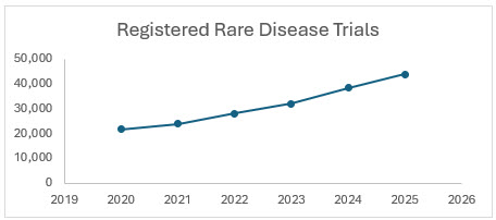 The number of registered rare disease clinical trials has shown consistent growth from 2020 to 2025, driven by increased investment, regulatory incentives, and advancements in precision medicine and digital health technologies.