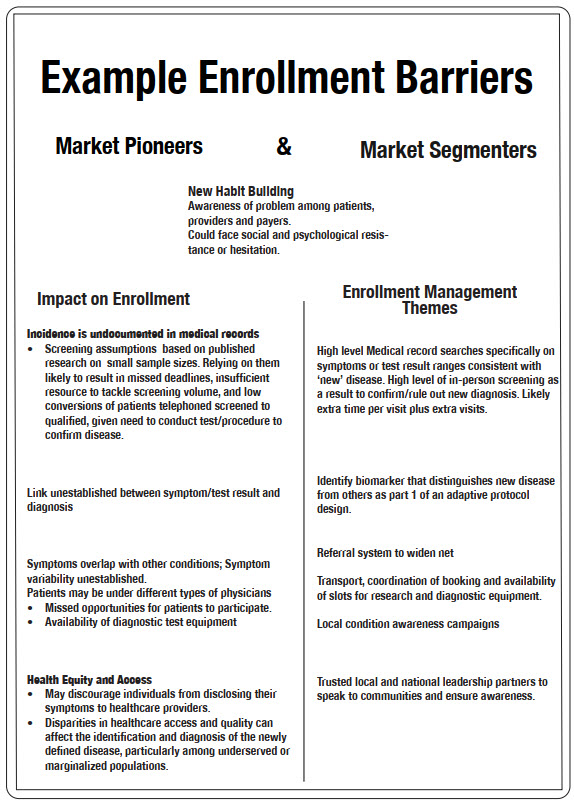 Translating adoption strategies into launch campaigns requires a talent approaching the level of artform. Need men to be okay with telling a doctor they’re “having trouble in the bedroom”? Get famous sports figures to admit to the same problem in a series of ads on the Golf Channel, and watch prescriptions get filled. Strategies such as this are designed to address a drug’s defining adoption attribute and require a deep understanding of current behaviors, practices, and preferences among patients, prescribers, and payers. This understanding is the foundation on which all else is built, be it patient enrollment or prescription sales. Failing to be fluent in this area is akin to constructing a house without a ground floor: anything subsequently built on faulty foundations likely won’t be strong enough to withstand the winds necessary to change the habits that underpin the healthcare status quo. We seemingly accept this truth when it comes to market launches, but when it comes to study ones, it gets lost among the million or so tasks we need to do to get a trial up and running. Yet aggressively addressing an IMP’s defining adoption attribute in a non-promotional way during study preparation would transform study’s launch, effectively shortening the time lapse between launch and FPFV. In the final article, we explore how various drug candidates come inherent with barriers to adoption, in the market and among participants and providers in clinical research, as well as ways in which to address these hurdles for faster, less costly trials.