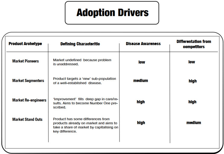 See Image 1 (Adoption Drivers) for a high-level summary of each product architype’s defining characteristic and how they rate in terms of disease awareness and competitor differentiation.
