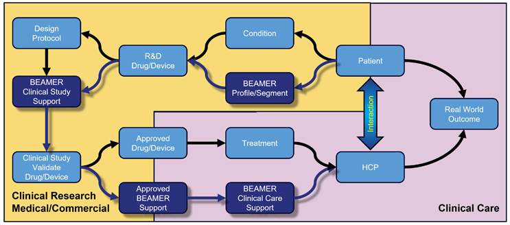A clinical research study is a much more controlled environment than treatment in clinical care, but there are significant similarities. In both, human beings, responding and behaving according to the factors that influence their status quo, are involved. BEAMER originated from a real-life issue in clinical care but, due to its behavioral approach, it is fully compatible with the clinical research environment.