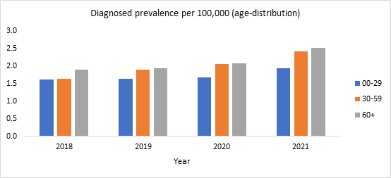 Figure 3. Diagnosed prevalence per 100,000 of LHON by age in the U.S. (2018-2021)