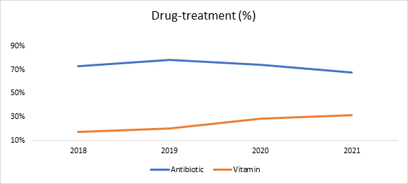 Despite the highest treatment share, antibiotics prescriptions have decreased by 7% whereas vitamin prescriptions (vitamins B, C, D, and others) increased by 78% between 2018 and 2021.