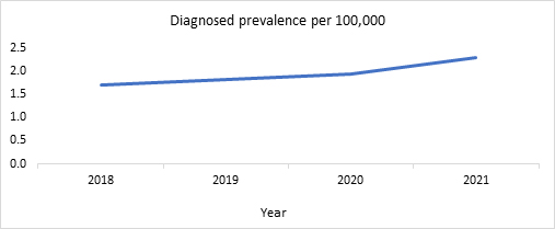 Figure 1. Diagnosed prevalence per 100,000 of LHON in the U.S. (2018-2021)