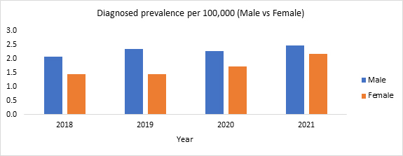 Figure 2. Diagnosed prevalence per 100,000 of LHON by gender in the U.S. (2018-2021)