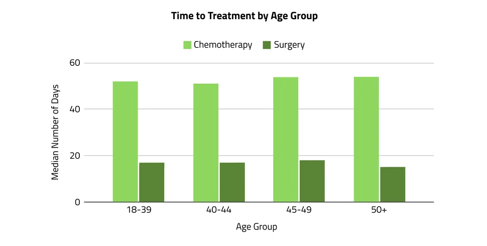 Among patients with at least one year of data following their diagnosis, 68% had received treatment within that time frame. Of those treated, 96% received surgery and 59% received chemotherapy. These patients waited a median of 16 days after their diagnosis to initiate surgery and 54 days to initiate chemotherapy. Patients age 50+ had the shortest time to treatment for surgery (15 days), and patients ages 40 to 44 (51 days) had the shortest for chemotherapy.