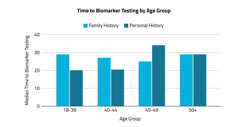 When comparing all patients with a high risk of CRC due to family history vs. personal history, the overall median times to testing and treatment were the same for both groups. However, larger differences were seen among younger age groups: Patients age 18 to 39 with high-risk personal histories received biomarker testing a median of 9 days earlier than those with high-risk family histories, and they also received treatment 5 days earlier. Patients ages 40 to 44 with high-risk personal histories received biomarker testing a median of 6 days earlier than those with high-risk family histories, and they received treatment 8 days earlier.