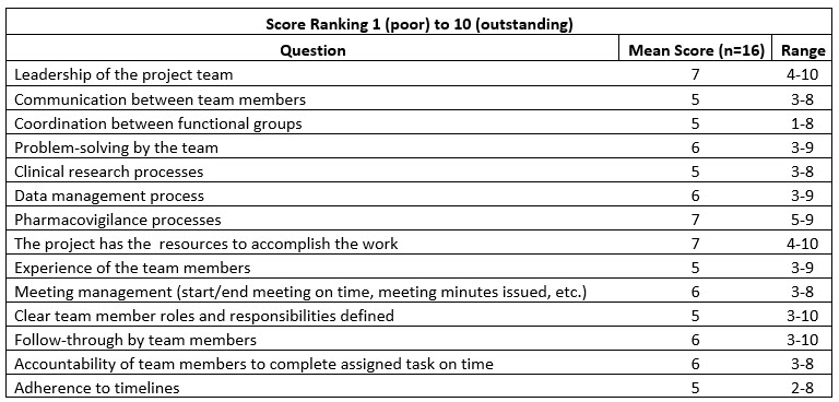 Within that questionnaire, use a 1-10 scale, with 1 meaning poor and 10 meaning outstanding, to rank team leadership, problem solving, clinical operation processes, communication, collaboration with the CRO, collaboration with the sponsor, etc., to define areas for discussion.
