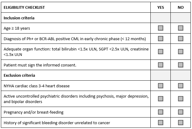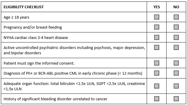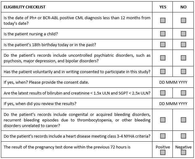 Consider the abbreviated sample checklist from a Phase 2 study in patients with an early phase chronic myeloid leukemia (CML) that illustrates the problem.