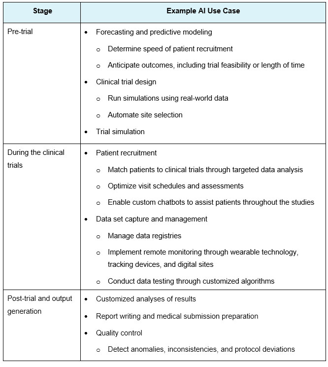 Life sciences organizations have ample opportunities to use AI throughout the clinical trial life cycle. Some of the potential use cases are shown in the following table.