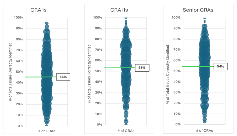 While some CRAs are correctly evaluated and given valuable feedback, the data presented above shows there are significant deficiencies in CRAs’ KSAs that often go undetected when using this traditional evaluation method.