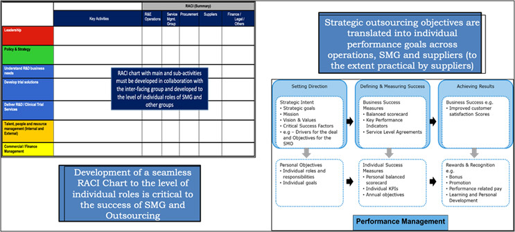 - Creation And Maintenance Of Seamless Interfaces With Internal Groups: The SMG ensures seamless interactions among stakeholders (e.g., legal, procurement, compliance, and functional groups like data management and quality). The early design of the SMG should involve clear delineation of roles and responsibilities of the various stakeholder groups/functions to the level of individual roles through a RACI (Responsible, Accountable, Consulted, and Informed) chart. The RACI is typically developed in collaboration with all the key stakeholder groups, leveraging best practices in organizational change and communications management. In our experience, strategic outsourcing programs are successful when the business’ functional objectives and outsourcing objectives are aligned through specific metrics for both the functional group doing the outsourcing and individual performance objectives of the team members (e.g., SMG).