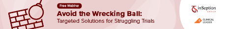 | | | | Webinar: Avoid the Wrecking Ball: Targeted Solutions for Struggling Trials | When a trial starts slipping off track, the instinct is often to “rescue” it — swap vendors, replace sites, or overhaul teams. But these costly moves usually treat symptoms, not the cause. The real problems often run deeper: misaligned protocols, overburdened sites, and unclear operational ownership. Discover how to fix what’s broken without hitting reset, so you stay on track, protect budgets, and deliver for patients. |